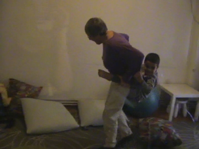 We found the perfect game with Stavros. He climbs onto my back and I ask him every time if he wants to fall back down. As soon as I get his answer, I start shaking my body until he gently falls on the pillow! We enjoyed this game for a long time!